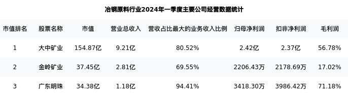 广东明珠最新报告期数据为一季度,下表汇总了冶钢原料行业内市值靠前的公司一季度主要经营数据