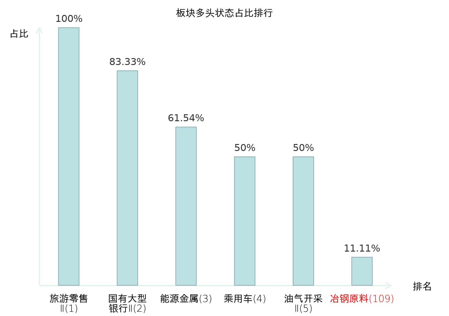 全市场所有行业板块中主力多头状态占比排名中,旅游零售Ⅱ板块位居第一。特钢Ⅱ板块名次提升最快,较昨日上升72位。