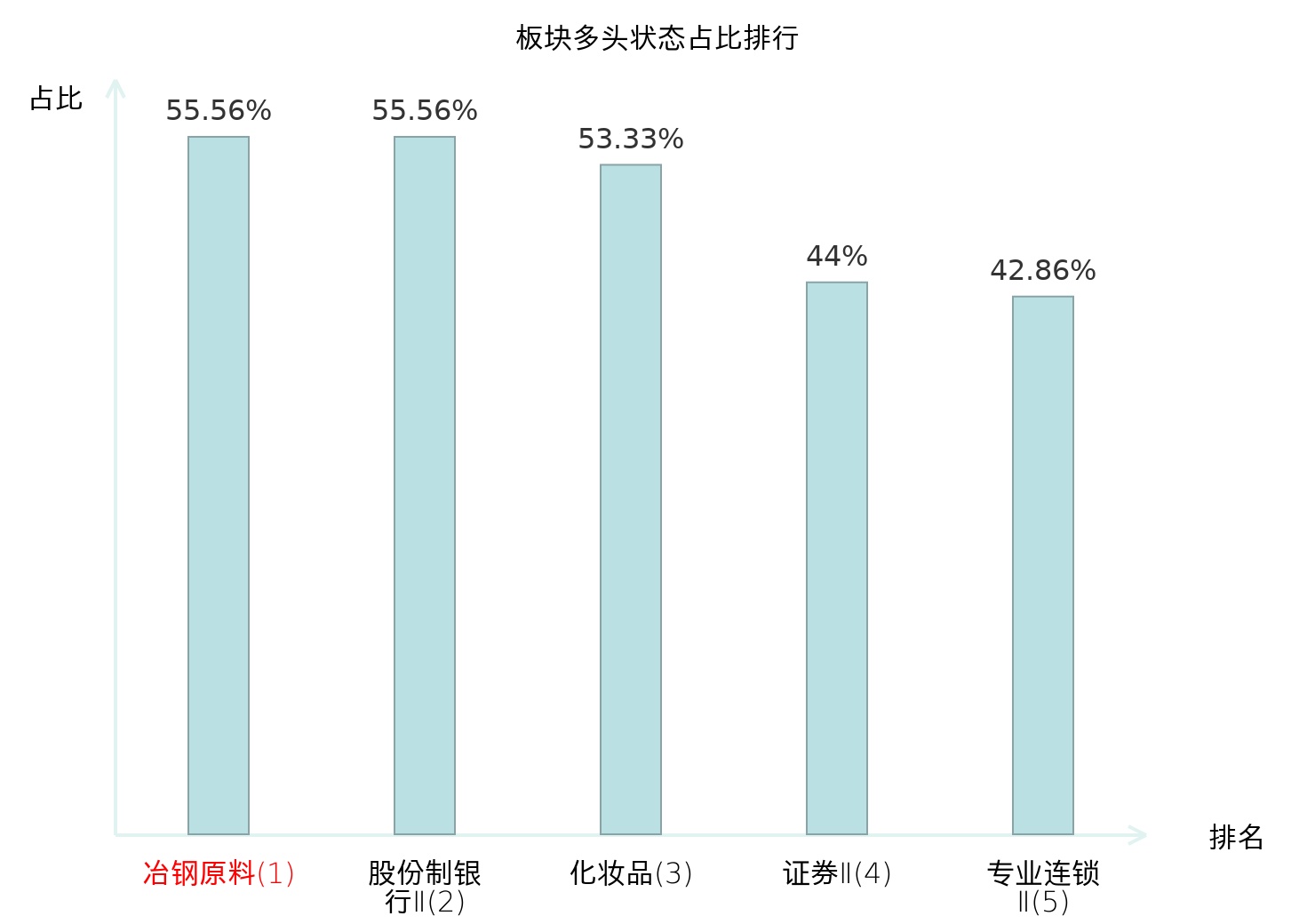 全市场所有行业板块中主力多头状态占比排名中,冶钢原料板块位居第一。保险Ⅱ板块名次提升最快,较昨日上升114位。