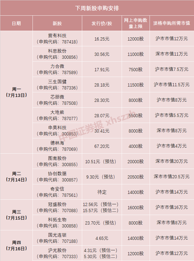 根据新股发行安排,下周将迎来15只新股申购,包括7只科创板新股、5只创业板新股、3只沪市主板新股。其中周一是超级打新日,当天有8只新股申购。