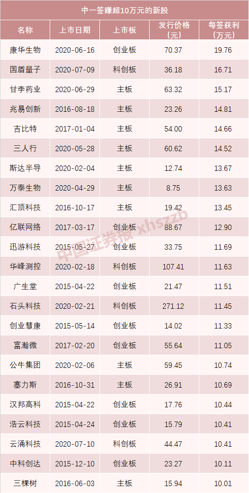 Wind数据显示,自2014年A股实行新股上市首日涨跌幅限制以来,共有23只新股的单签盈利超过10万元,其中有10只是今年上市的新股。目前康华生物以19.76万元的单签盈利排在榜首,国盾量子和甘李药业分别以16.71万元、15.17万元的单签盈利排在第二和第三的位置。