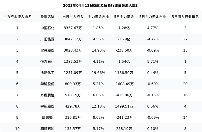 从主力资金流向来看,炼化及贸易行业今日主力资金流入43.77亿元,在所有申万二级行业中排名:49/131。