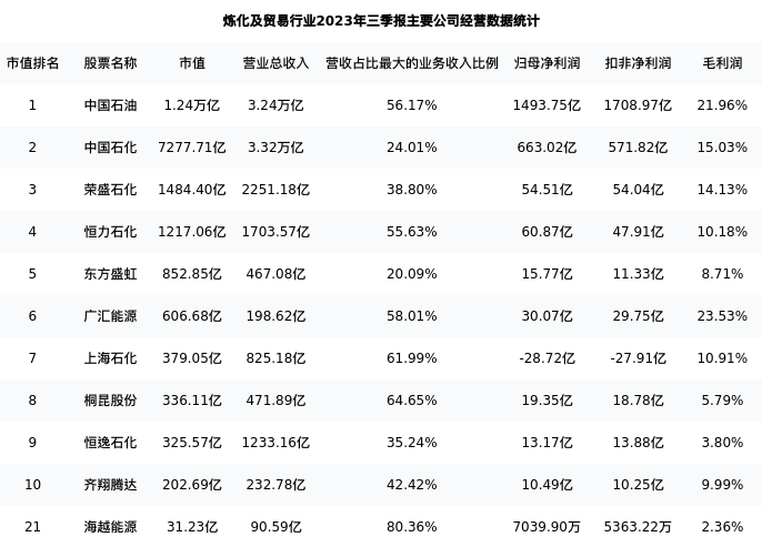 海越能源最新报告期数据为三季报,下表汇总了炼化及贸易行业内市值靠前的公司三季报主要经营数据