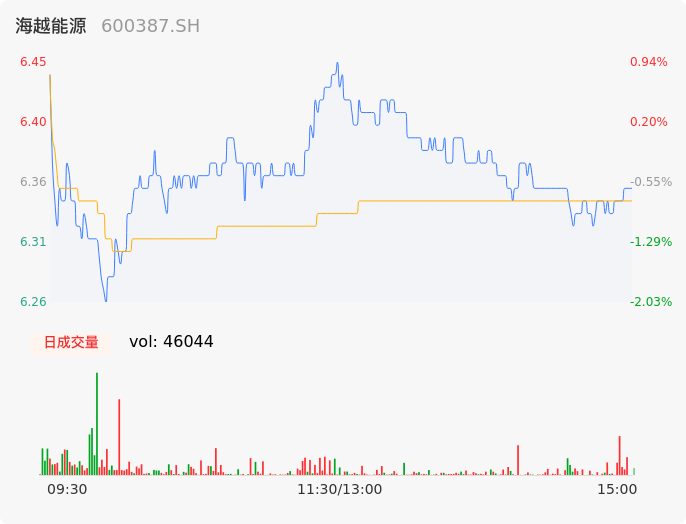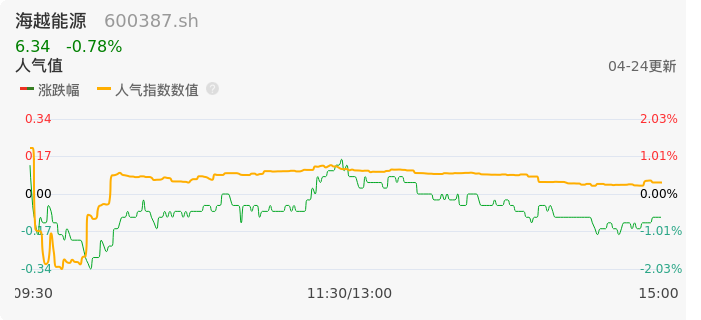 04月24日,海越能源收报6.34,股价涨幅-0.78%,成交金额2919.27万元,换手率1.14%。