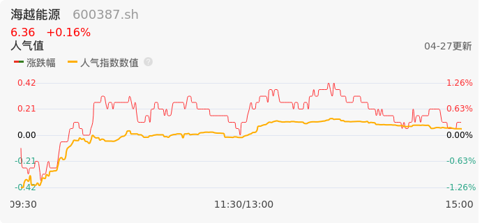 04月27日,海越能源收报6.36,股价涨幅0.16%,成交金额3811.08万元,换手率1.48%。