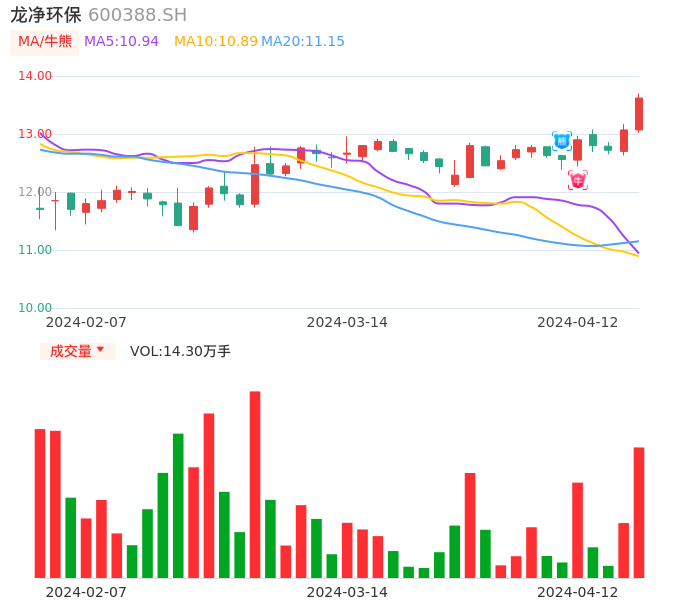 04月12日,龙净环保收报13.62,股价涨幅4.21%,成交金额1.92亿元,换手率1.32%。