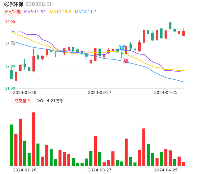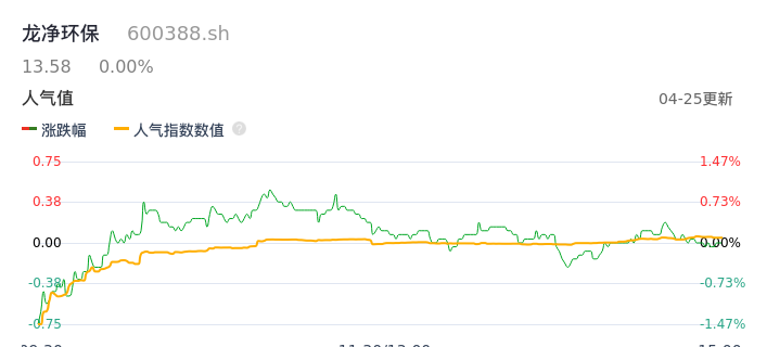 04月25日,龙净环保收报13.58,股价涨幅0.00%,成交金额5715.50万元,换手率0.39%。