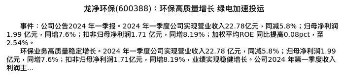 值得注意的是:2024年04月东吴证券的袁理/曾朵红/任逸轩分析师,首次发布关于龙净环保的研究报告,标题为:龙净环保(600388):环保高质量增长 绿电加速投运。