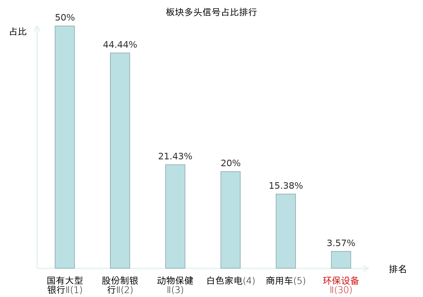 全市场所有行业板块中主力多头信号占比排名中,国有大型银行Ⅱ板块位居第一。房屋建设Ⅱ板块名次提升最快,较昨日上升114位。