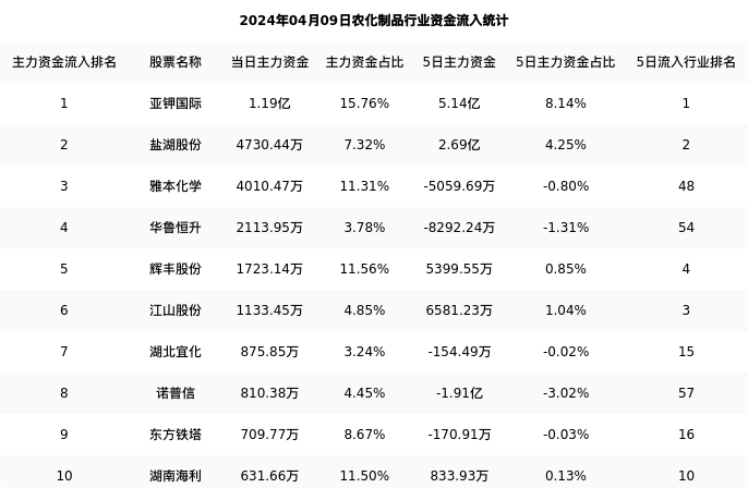 从主力资金流向来看,农化制品行业今日主力资金流入20.06亿元,在所有申万二级行业中排名:3/131。