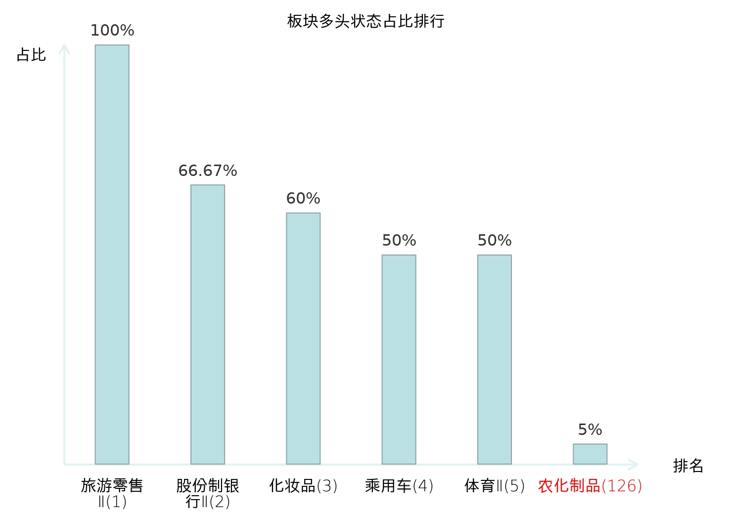 全市场所有行业板块中主力多头状态占比排名中,旅游零售Ⅱ板块位居第一。旅游零售Ⅱ板块名次提升最快,较昨日上升130位。