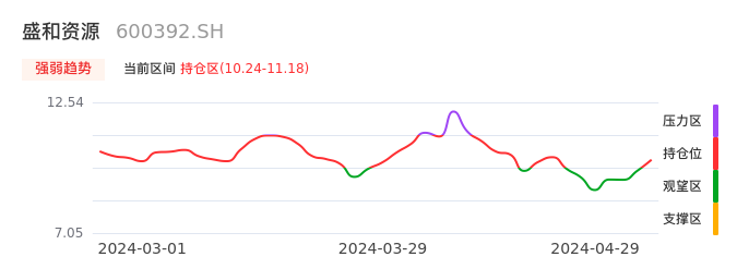 我们来看一下该股的九方特色指标强弱趋势的情况:盛和资源近日从观望区上穿到持仓区。股价短期站稳多头区域,上升动能仍较为充足,可积极关注。后续重点关注上方压力位:11.18元是否能突破上攻。