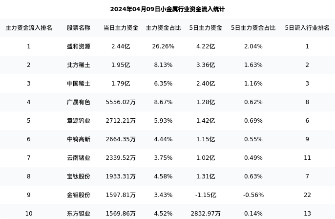 盛和资源今日净流入2.44亿元,主力占比26.26%,在行业内排名:1/23;5日净流入4.22亿元,主力占比2.04%,在行业内排名:1/23。