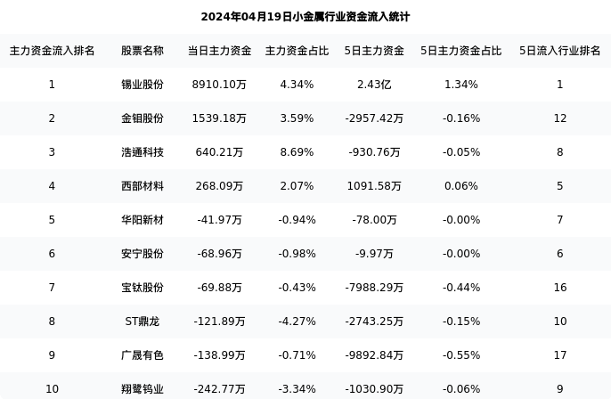 从主力资金流向来看,小金属行业今日主力资金流入40.17亿元,在所有申万二级行业中排名:64/131。