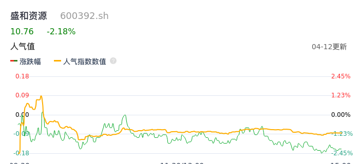 04月12日,盛和资源收报10.76,股价涨幅-2.18%,成交金额5.46亿元,换手率2.87%。