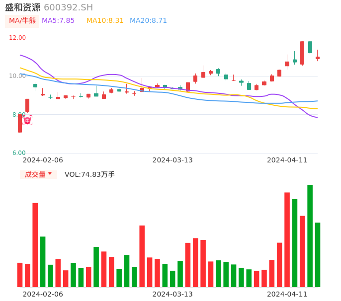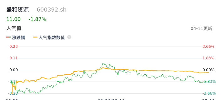 04月11日,盛和资源收报11.00,股价涨幅-1.87%,成交金额8.25亿元,换手率4.27%。
