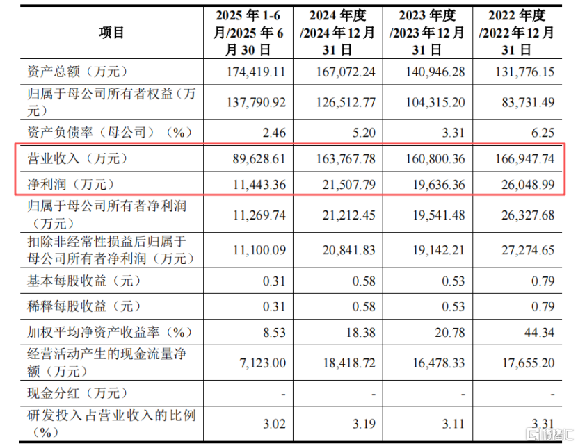 2022年、2023年、2024年、2025年1-6月(报告期),公司营业收入分别为16.69亿元、16.08亿元、16.38亿元、8.96亿元,净利润分别为2.6亿元、1.96亿元、2.15亿元、1.14亿元,经营活动产生的现金流量净额分别为1.77亿元、1.65亿元、1.84亿元、7123万元。
