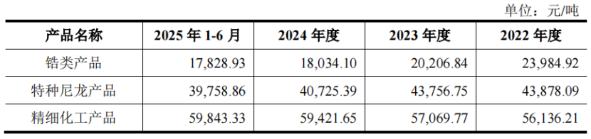 2022年至2025年上半年,公司特种尼龙产品的销售单价由4.39万元/吨下降至3.98万元/吨,也是因为原材料二元胺和二元酸的采购均价下降所致。