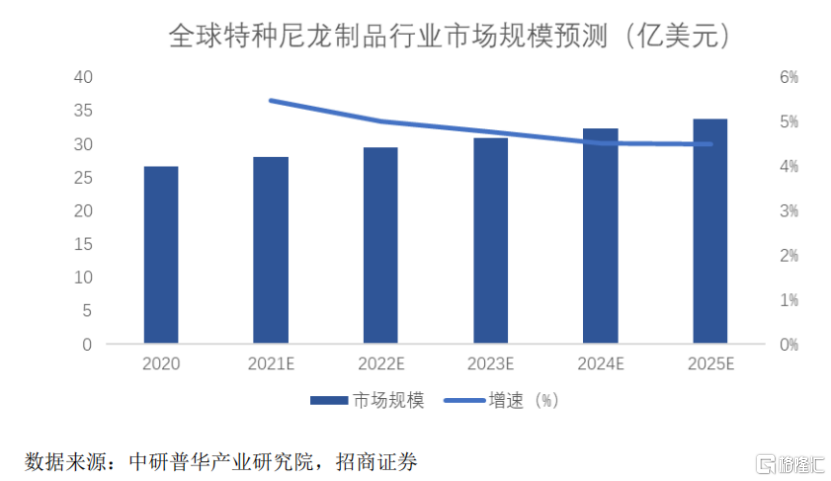 其中,特种尼龙方面,招商证券数据显示,2020年全球特种尼龙市场规模已达26.64亿美元。据中研普华产业研究院预测,2025年全球特种尼龙市场规模将达到33.37亿美元,2020年至2025年的复合年均增长率为4.03%。