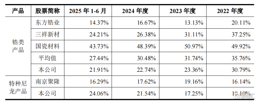 其中,锆类产品毛利率由2022年的30.79%下降至2025年上半年的21.91%,主要是因为锆类产品销售价格下降幅度大于成本下降幅度。