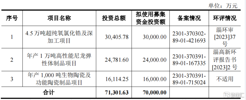 公司本次计划募集资金7亿元,主要用于4.5万吨超纯氧氯化锆及深加工项目、年产1万吨高性能尼龙弹性体制品项目、年产1000吨生物陶瓷及功能陶瓷制品项目。