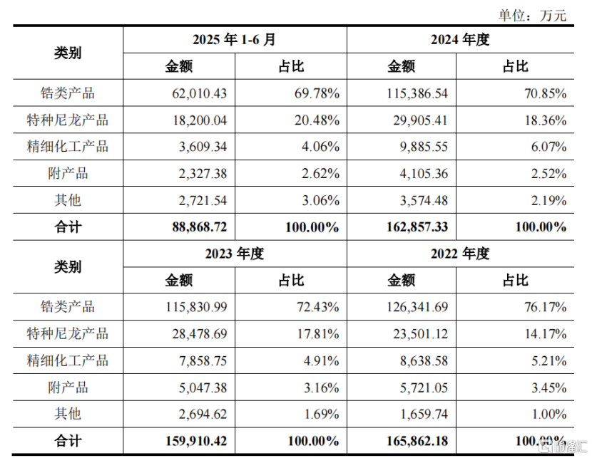 长裕集团收入的主要来源为锆类产品及特种尼龙产品。