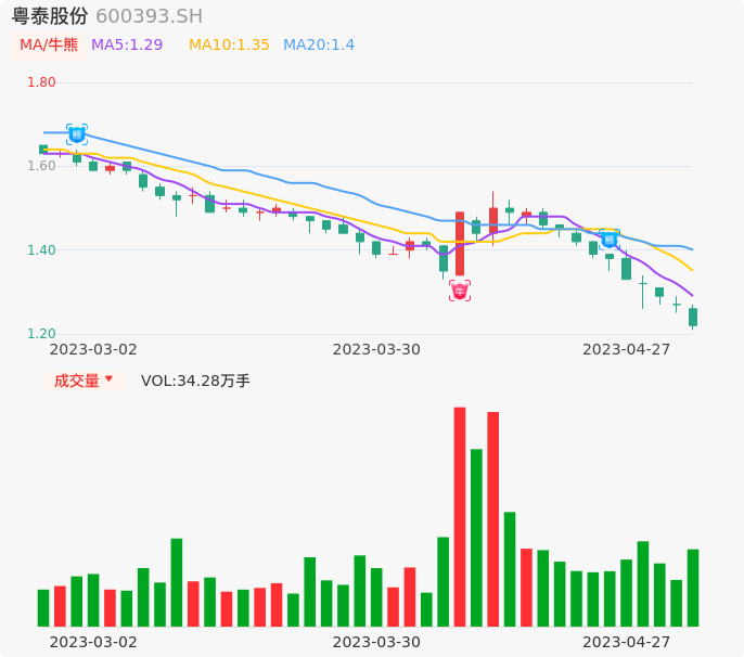 04月27日,粤泰股份收报1.22,股价涨幅-3.94%,成交金额4262.35万元,换手率3.41%。