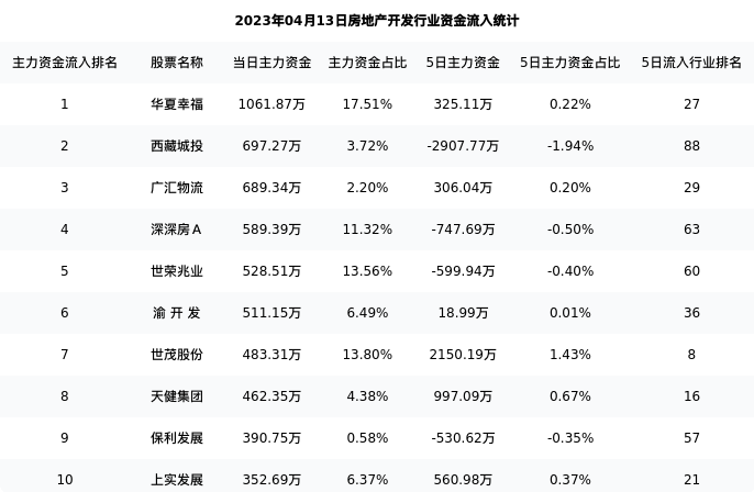 下表为今日行业内流入前10股票的信息