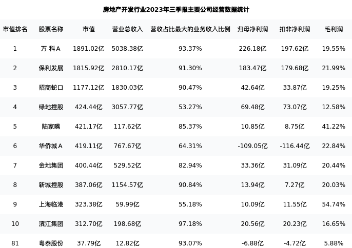 粤泰股份最新报告期数据为三季报,下表汇总了房地产开发行业内市值靠前的公司三季报主要经营数据