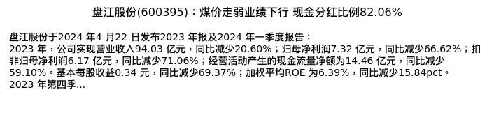 值得注意的是:2024年04月中泰证券的杜冲分析师,首次发布关于盘江股份的研究报告,标题为:盘江股份(600395):煤价走弱业绩下行 现金分红比例82.06%。