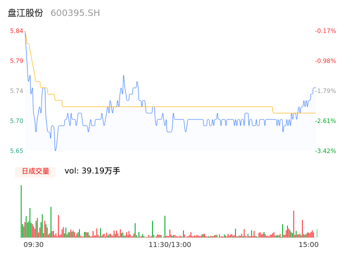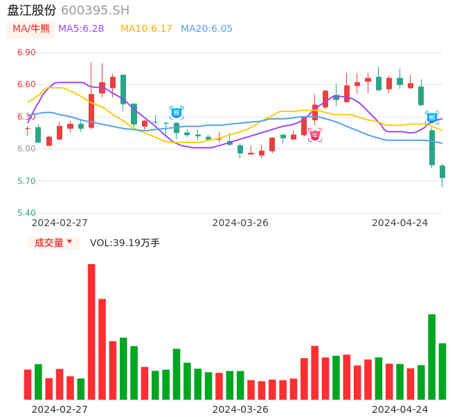 04月24日,盘江股份收报5.73,股价涨幅-2.05%,成交金额2.24亿元,换手率1.83%。