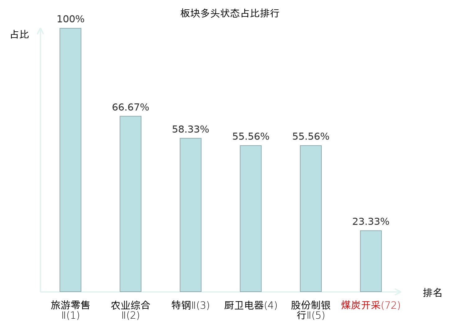 全市场所有行业板块中主力多头状态占比排名中,旅游零售Ⅱ板块位居第一。农业综合Ⅱ板块名次提升最快,较昨日上升127位。