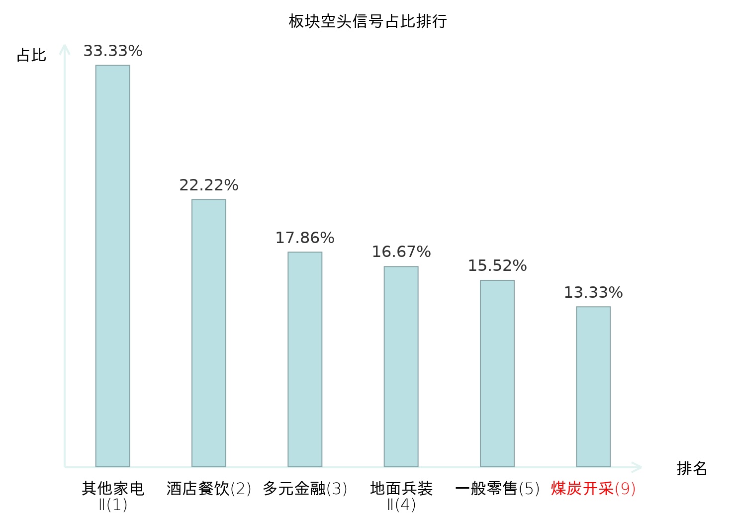 全市场所有行业板块中主力空头信号占比排名中,其他家电Ⅱ板块位居第一。广告营销板块名次提升最快,较昨日上升111位。