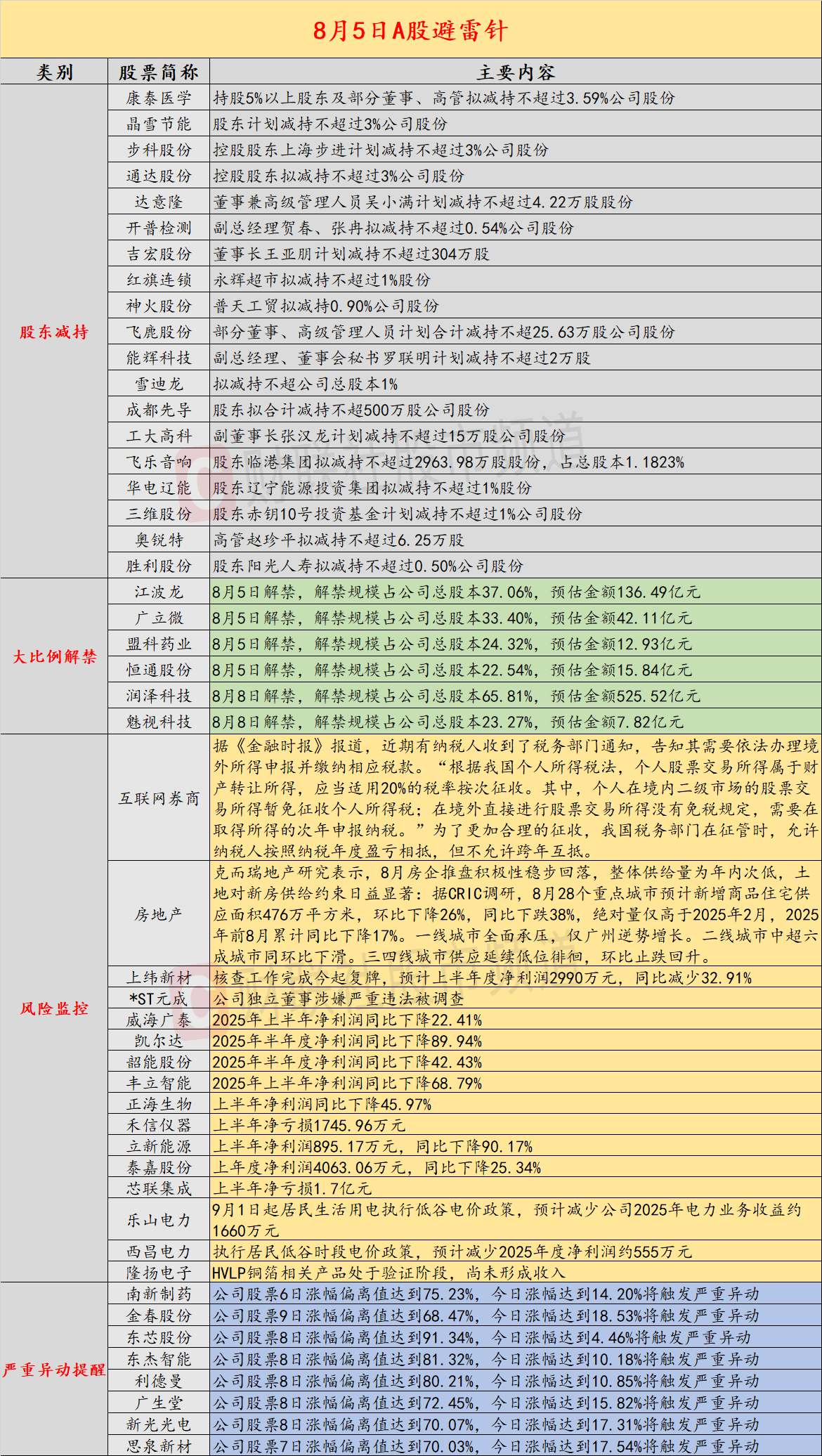 导读:财联社8月5日投资避雷针,近日,A股及海外市场潜在风险事件如下。国内经济信息方面包括:1)加强个人境外收入监管,境外买卖股票收入也要缴税;2)克而瑞地产研究表示,8月房企推盘积极性稳步回落,一线城市全面承压;公司方面重点关注包括:1)上纬新材核查工作完成今起复牌,预计上半年度净利润2990万元,同比减少32.91%;2)*ST元成公司独立董事涉嫌严重违法被调查;海外市场重点关注包括:1)WTI原油期货收跌1.54%,布伦特原油期货收跌1.31%;2)特朗普称将大幅提高对印度关税。