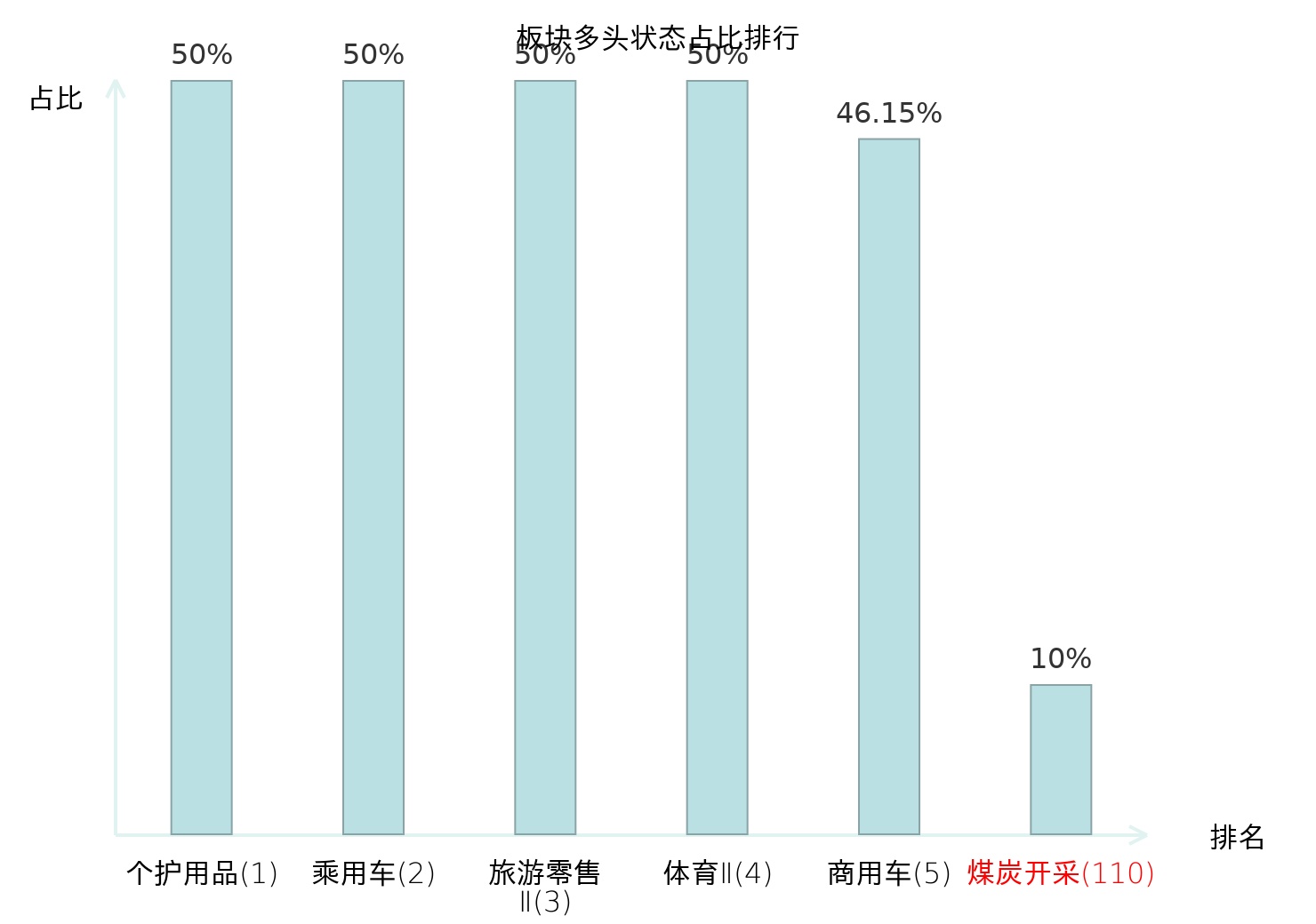全市场所有行业板块中主力多头状态占比排名中,个护用品板块位居第一。林业Ⅱ板块名次提升最快,较昨日上升94位。