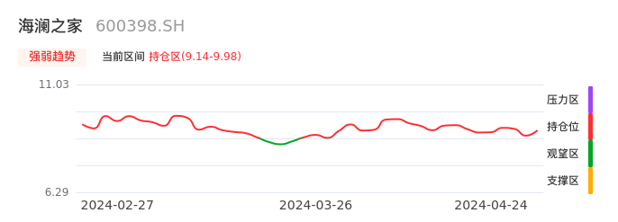 我们来看一下该股的九方特色指标强弱趋势的情况:海澜之家自03月25日从观望区上穿到持仓区。股价近期在多头区域持续强势上扬,上升动能仍较为充足,可积极关注。后续重点关注上方压力位:9.98元是否能突破上攻。
