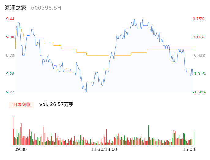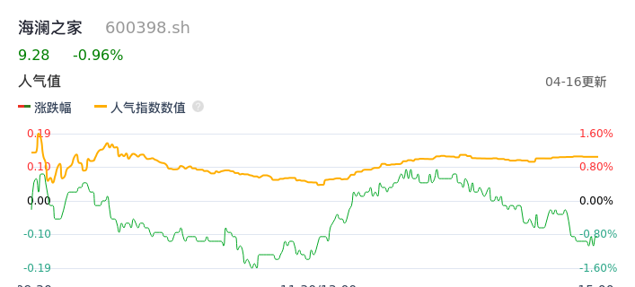 04月16日,海澜之家收报9.28,股价涨幅-0.96%,成交金额2.48亿元,换手率0.55%。