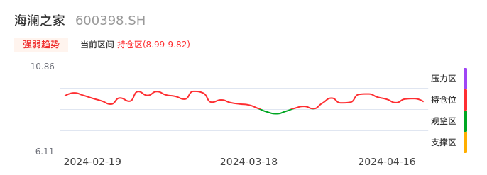 我们来看一下该股的九方特色指标强弱趋势的情况:海澜之家自03月25日从观望区上穿到持仓区。股价近期在多头区域回调整理。后续重点关注多空分界点的争夺:8.99元。如未能有效站稳则可能重新回到空头行情。
