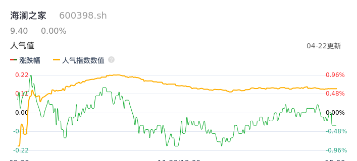 04月22日,海澜之家收报9.40,股价涨幅0.00%,成交金额1.64亿元,换手率0.36%。