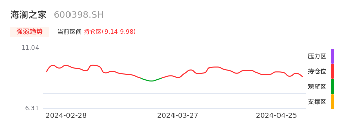 我们来看一下该股的九方特色指标强弱趋势的情况:海澜之家自03月25日从观望区上穿到持仓区。股价近期在多头区域回调整理。后续重点关注多空分界点的争夺:9.14元。如未能有效站稳则可能重新回到空头行情。