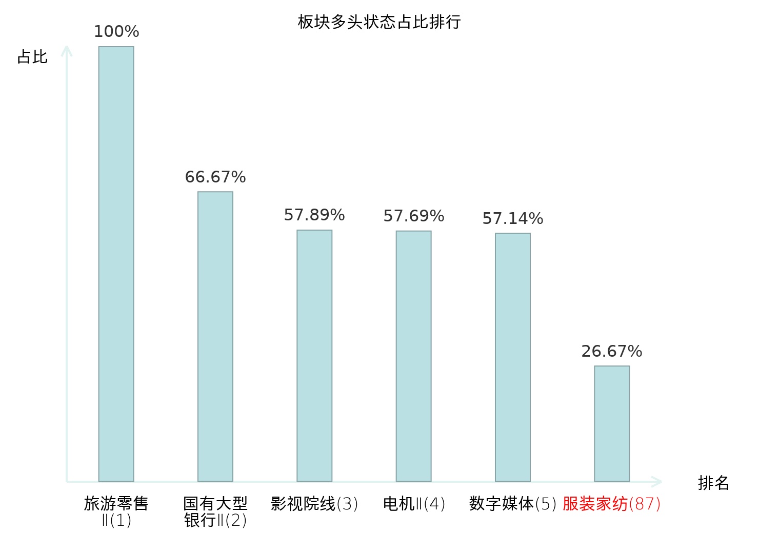 全市场所有行业板块中主力多头状态占比排名中,旅游零售Ⅱ板块位居第一。专业连锁Ⅱ板块名次提升最快,较昨日上升56位。
