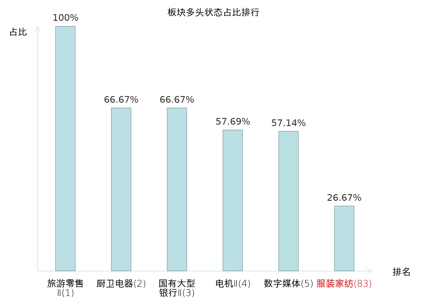 全市场所有行业板块中主力多头状态占比排名中,旅游零售Ⅱ板块位居第一。汽车服务板块名次提升最快,较昨日上升70位。