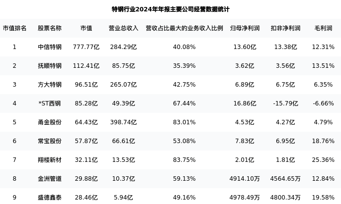 抚顺特钢最新报告期数据为年报,下表汇总了特钢行业内市值靠前的公司年报主要经营数据