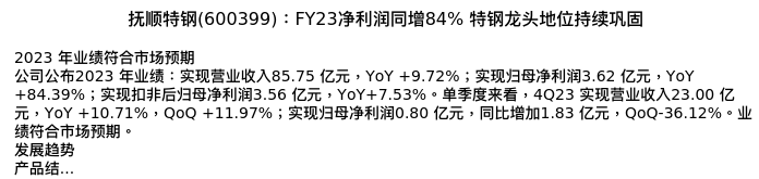 值得注意的是:2024年04月中金公司的刘中玉/张树玮/刘婧/陈显帆分析师,首次发布关于抚顺特钢的研究报告,标题为:抚顺特钢(600399):FY23净利润同增84% 特钢龙头地位持续巩固。