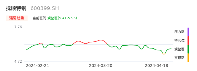 我们来看一下该股的九方特色指标强弱趋势的情况:抚顺特钢近日从支撑区回到观望区。股价经过前期快速下跌后已经出现止跌迹象。下跌动能有所衰竭,股价目前处于反弹阶段,后续重点关注能否站上多空分界点:5.95元。如未能有效突破则说明弱势反弹行情结束。后续可能再次进入空头行情。