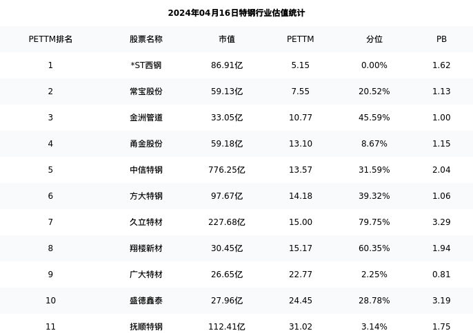 从估值角度看:抚顺特钢最新市盈率PETTM为31.02,在行业内排名11/13,处于3.14分位。