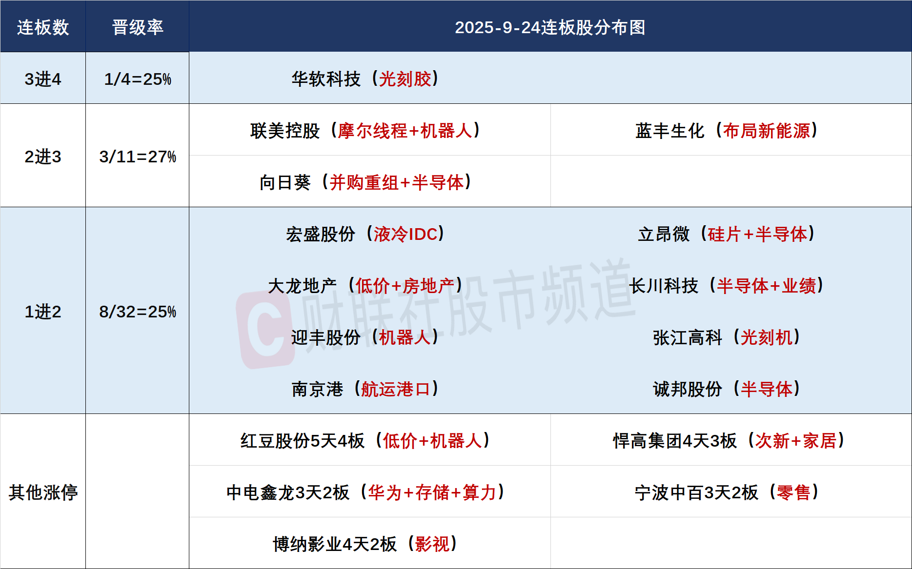 财联社9月24日讯,今日78股涨停,28股炸板,封板率为74%,华软科技4连板,凯美特气6天5板,向日葵20cm3连板,联美控股、蓝丰生化3连板,红豆股份5天4板,大龙地产、悍高集团4天3板,北交所恒合股份30cm首板。市场低开高走,创业板指盘中再创3年多新高,科创50指数一度涨近5%。沪深两市成交额2.33万亿,较上一个交易日缩量1676亿。全市场超4400只个股上涨,下跌家数不足900家。板块方面,存储芯片、光刻机、能源金属等板块涨幅居前,旅游等板块跌幅居前。截至收盘,沪指涨0.83%,深成指涨1.80%,创业板指涨2.28%。
