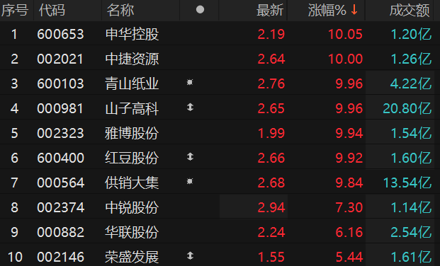上证报中国证券网讯 9月2日,低价股早盘表现活跃,截至9时44分,申华控股、中捷资源、青山纸业、山子高科、雅博股份、红豆股份等多只低价股封涨停板。
