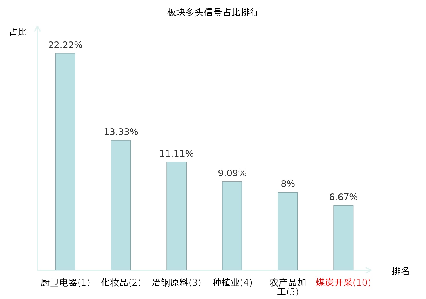 全市场所有行业板块中主力多头信号占比排名中,厨卫电器板块位居第一。化妆品板块名次提升最快,较昨日上升104位。