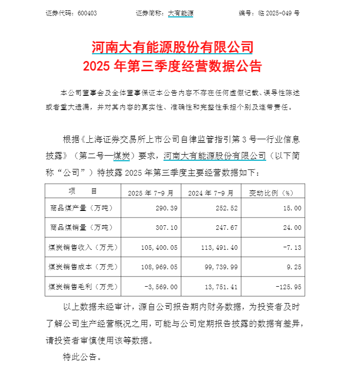 10月22日晚间,大有能源(600403)发布了第三季度经营数据。数据显示,第三季度,公司商品煤产量290.39万吨,同比增加15%;商品煤销量307.10万吨,同比增加24%。三季度,公司煤炭销售收入10.54亿元,同比减少7.13%;煤炭销售成本10.9亿元,同比增加9.25%;煤炭销售毛利-3569万元。上述数据未经审计。